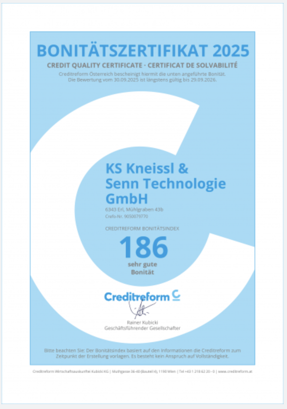 Wir freuen uns, bekannt geben zu dürfen, dass die KS Kneissl & Senn Technologie GmbH von Creditreform Österreich erneut mit dem Bonitätszertifikat ausgezeichnet wurde.