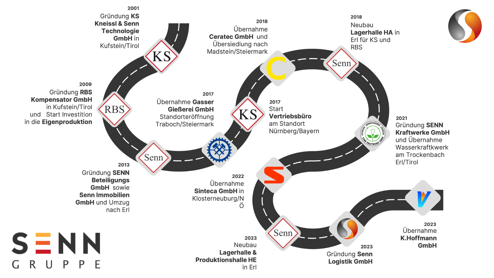Das Schaubild zeigt die Geschichte der SENN Gruppe. Im Jahr 2001 wurde das Unternehmen von Franz Senn sen. in Kufstein gegründet. Seither sind im Laufe der Jahre verschiedene Unternehmen zur Gruppe hinzugekommen. Im Jahr 2023 wird das Highlight der Umzug in die neue Lager- und Produktionshalle in Erl, Mühlgraben 43e sein. Damit wird der Raum für weiteres Wachstum geschaffen.